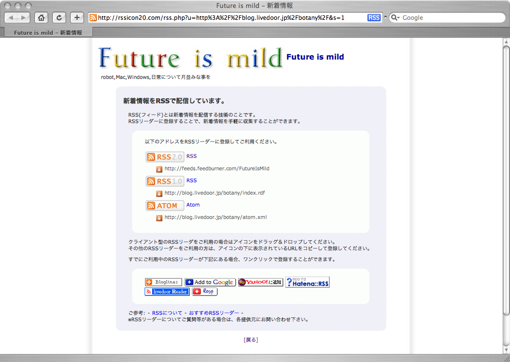 このブログで用意している3種類のRSS/ATOMが表示され、アイコン(と言うかボタン?)の下にある矢印をクリックするとFeedの一覧を見ることができます。ちなみにこのブログのお勧めは、"FeedBurner"を利用したRSS2.0形式の奴(http://feeds.feedburner.com/FutureIsMild)です。なお、アイコン画像は自由に置き換え可能です。