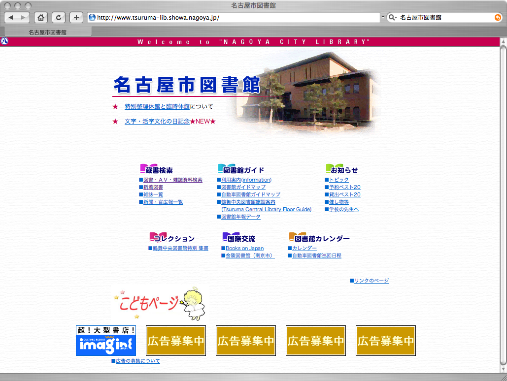 名古屋市図書館ホームページ広告はしばらく前から募集していたんだけど、ようやく昨日広告が付いたのを見た。イマジンですか。![]()