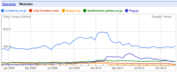Google Trends for Websites: b.hatena.ne.jp,clip.livedoor.com,buzzurl.jp,bookmarks.yahoo.co.jp,flog.jp